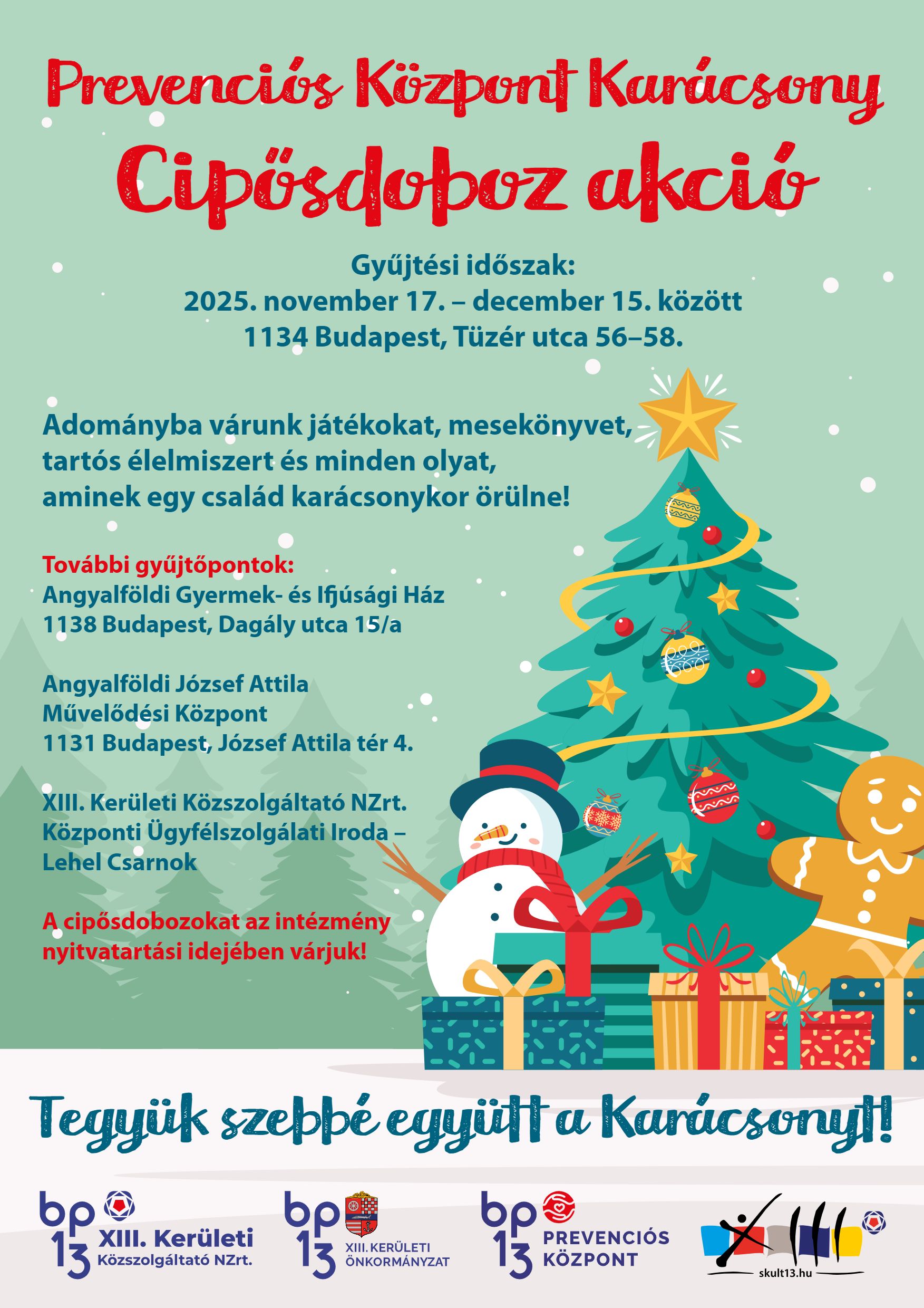 A cipősdobozokat kerületünkben idén az Angyalföldi József Attila Művelődési Központban, ezen kívül az Angyalföldi Gyermek- és Ifjúsági Házban, a Lehel Csarnokban található Központi Ügyfélszolgálati Irodában és a Prevenciós Központban lehet leadni nyitvatartási időben.
