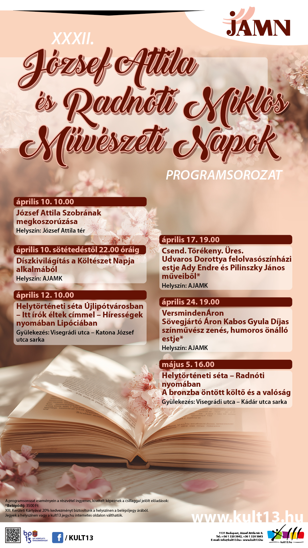Hagyományainkhoz híven idén is a színes programkínálattal jelentkezik a József Attila Művészeti Napok a XIII. kerületben. Programsorozatunk névadójának, József Attila születésének 121. évfordulóját ünnepeljük idén, mely alkalomból a hagyományosan április 11-től rendezett programsorozatunk ezúttal is programok széles sorát kínálja a kerületieknek.