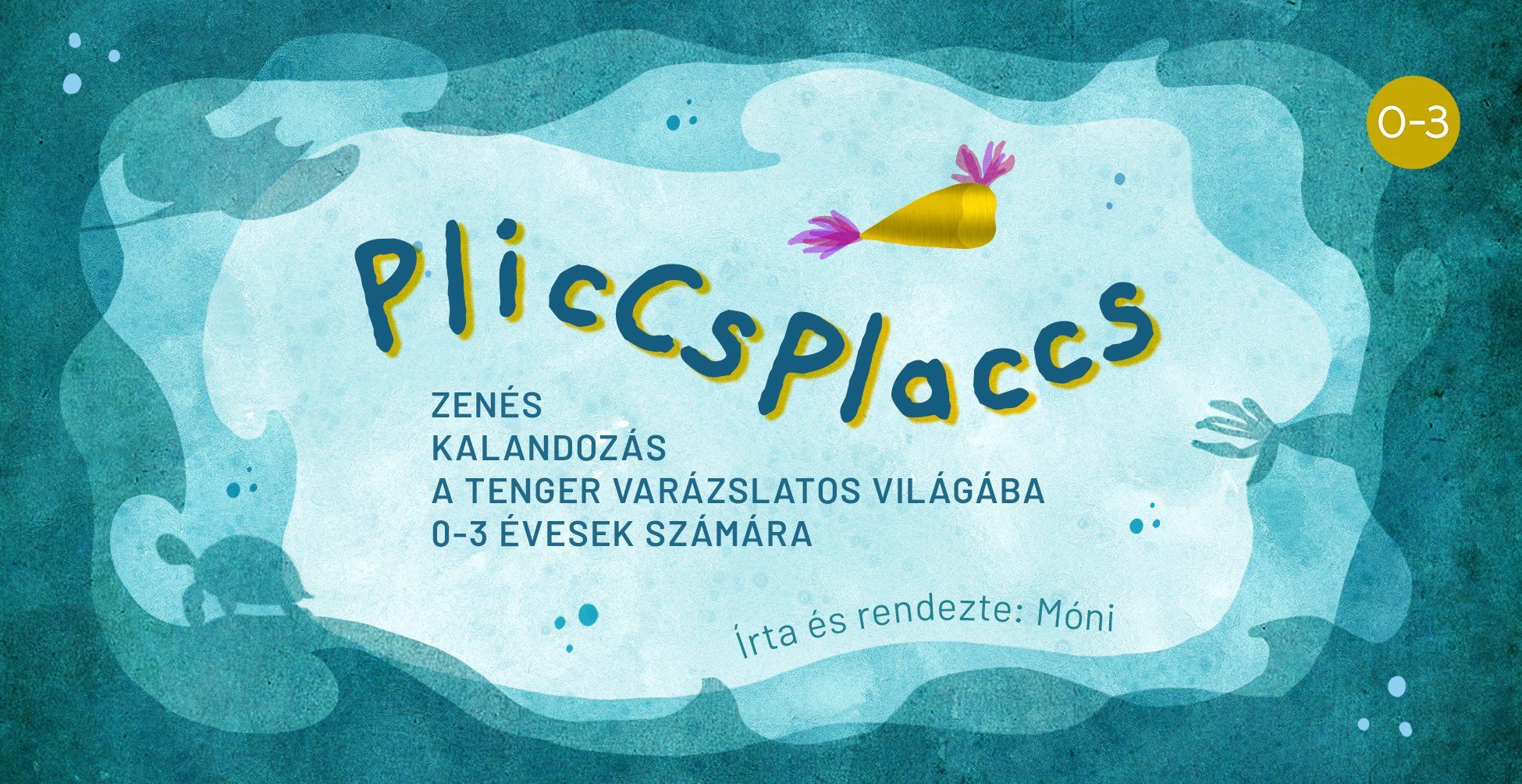 A Pliccsplaccs csecsemőszínházi előadás a legkisebbeket a tenger világába kalauzolja el. A kicsik egy kalandor halacska szemével kukkanthatnak bele a varázslatos vízi életbe. Az előadás bábokkal és megnyugtató bájos dallamokkal várja a gyerekeket.