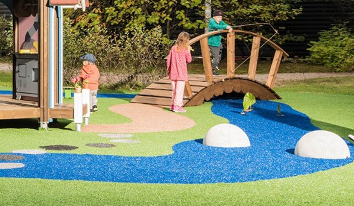 A játszótér egyik meghatározó eleme a zöld gumiburkolatban kanyargó, patakot imitáló kék sáv, melyen fahíd vezet keresztül, szélén gombák, virágok erősítik a hangulatot.