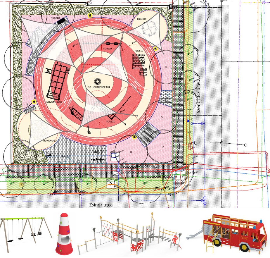 Emellett egy többfunkciós tűzoltó akadálypálya is szerepel a tervek között. A pálya akadályelemei, a vízszintes mászóháló, kapaszkodó rudak, egyensúlyozó elemek, függeszkedő pálya, mászófal panel, eltérő nehézségi szinten kínálnak mozgásos feladatokat, amelyek játékos formában fejlesztik a gyermekek fizikai erőnlétét, egyensúlyát és motorikus képességeit.