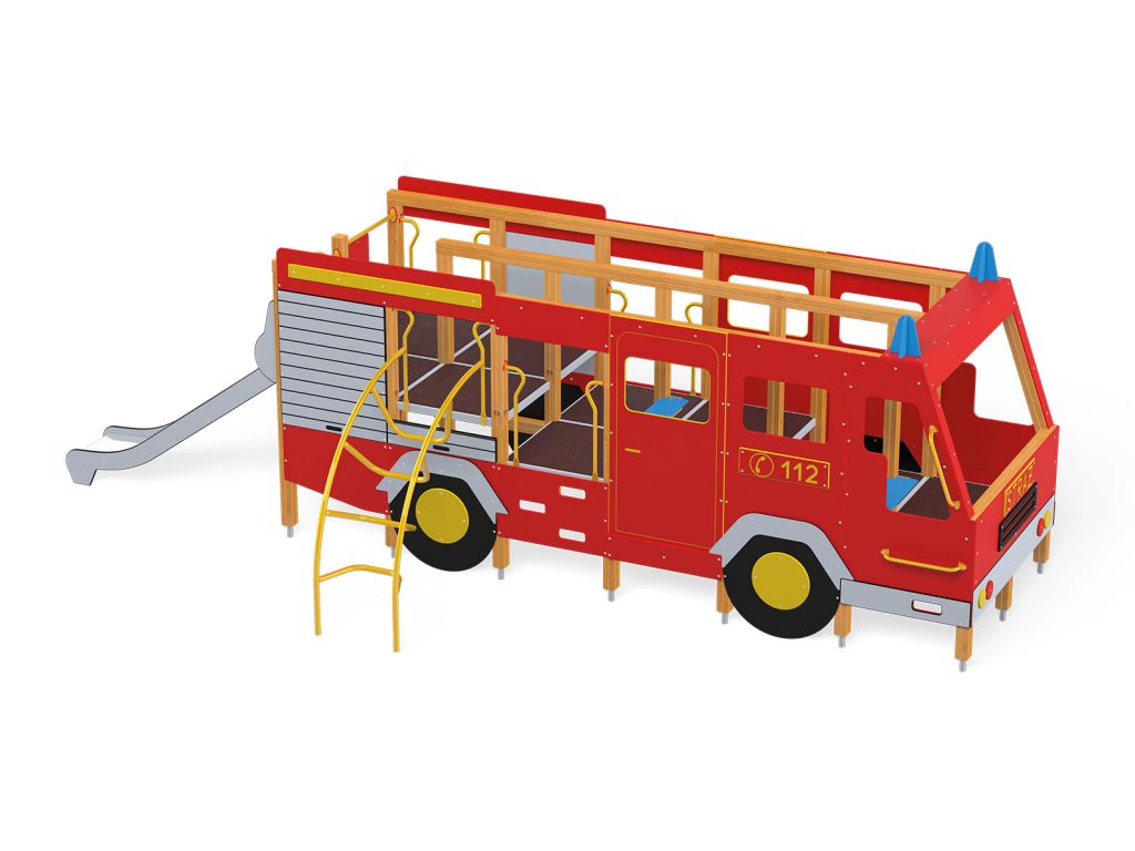 A játszótér fő attrakciója ebben a változatban egy nagyméretű, tűzoltóautót formázó komplex eszköz, amely több funkciót egyesít: csúszda, mászófal, kötélmászó elemek, tematikus díszítőelemek (így közöttük kormány, műszerfal, oltócső játék), szerepjátékra alkalmas vezetőfülke. Az eszköz egyszerre fejleszti az egyensúlyérzéket, a koordinációt, a mászóképességet és a szerepjátékos, szociális készségeket.