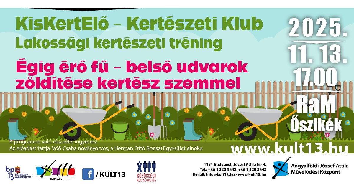 Novemberben újra lakossági kertészeti tréningre várjuk az érdeklődőket, ezúttal rendezvényünket a RaM Őszikék klubjában. Ezúttal is várjuk a kis kertjükben vagy erkélyükön kertészkedőket előadással, ahol hasznos tanácsokat, tudnivalókat ismerhetnek meg hobbijuk témakörében a KisKertElő programsorozat keretében.