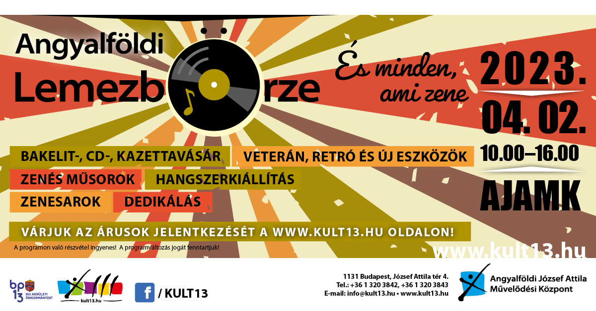 Hagyományteremtő szándékkal klasszikus, ám különleges programelemekkel színesített lemezbörze sorozatot szervezünk Angyalföldön, ahol az ide látogatók nem csak válogathatnak kedvenc előadóik lemezei közül és találhatnak igazi ritkaságokat, de mindeközben élvezhetik a mini koncerteket és zenés műsorokat, riportokat, találkozhatnak a zenei élet meghatározó szereplőivel, megtekinthetik a kiállított hangszereket, kipróbálhatják a szabad zenei sarkot, dedikáláson vehetnek részt és emellett persze egy új közösséget is építhetnek.