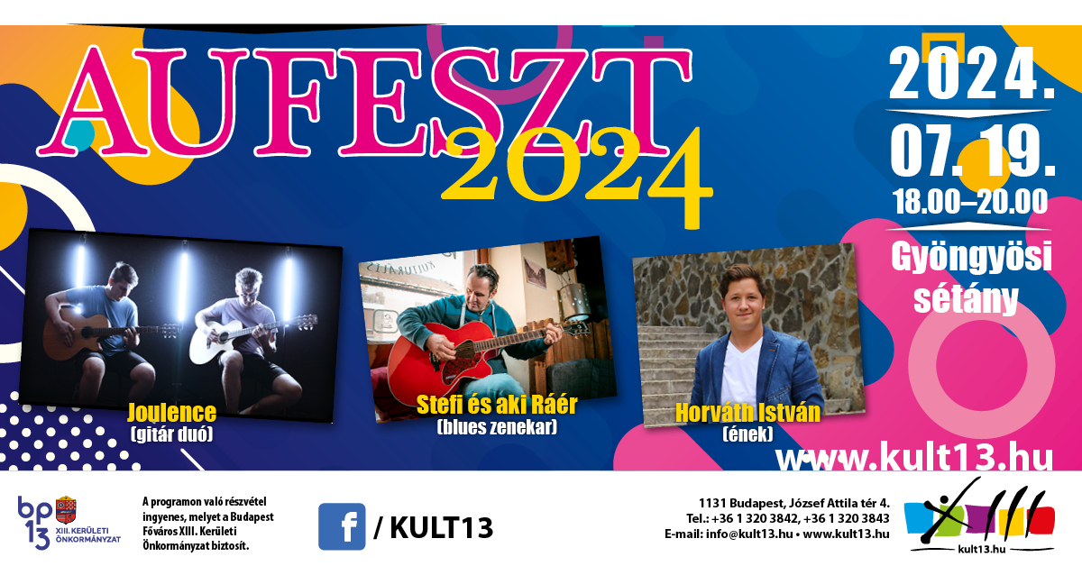 Idén megújult formában rendezzük meg a 12 éves nyári, szabadtéri programsorozatot, ismét elsősorban fiatal pályakezdő előadóművészek közreműködésével, és a zenei műfajok sokszínűségével. A májustól havonta jelentkező koncertek műsorán a poptól a blues-on át a jazz-ig és tovább, számos műfajjal és tehetséggel találkozhat a közönség a kerület szebbnél szebb parkjaiban és sétányain. A fellépőkre lehet szavazni is, akár a helyszínen meghallgatva műsorukat, akár a KULT13.hu facebook oldalon közzétett videóik alapján. A sorozat végén a díjazás ezen szavazatok alapján történik, és a szavazók között is ajándékokat sorsolunk majd ki.