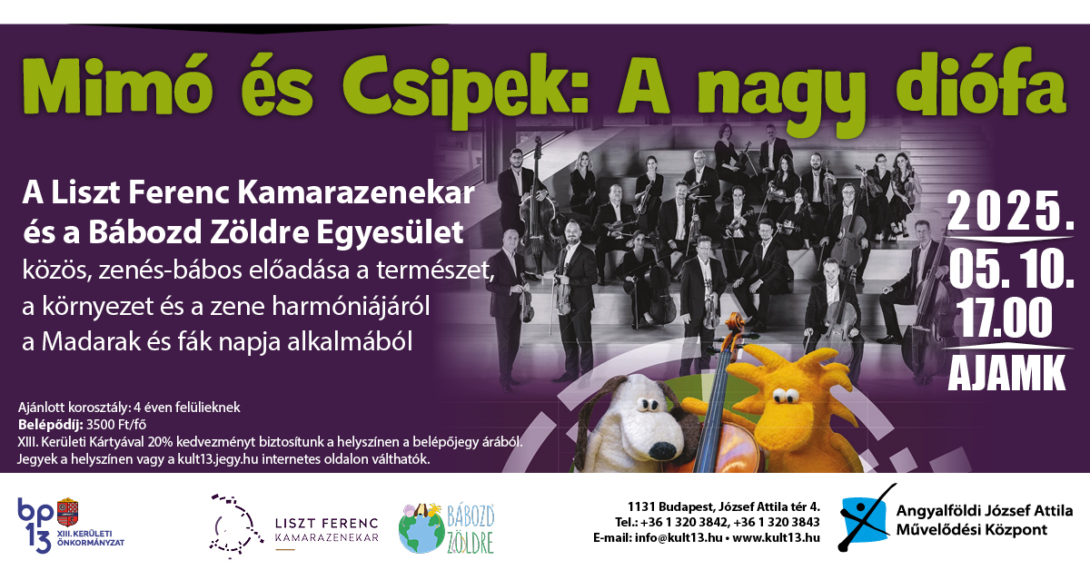 Mimó és Csipek: A nagy diófa – Liszt Ferenc Kamarazenekar és a Bábozd Zöldre Egyesület közös családi előadása a Madarak és fák napja alkalmából