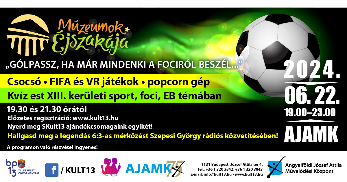 A Múzeumok Éjszakája programjához csatlakozva idén is várjuk látogatóinkat az Angyalföldi József Attila Művelődési Központba. A rendezvény mottója a ”Gólpassz, ha már mindenki a fociról beszél”. Foci, EB és XIII. kerületi sport témában hangulatos, vezetett kvízesttel készülünk, melyre várjuk a versenyzők előzetes jelentkezését június 21., 13.00 óráig. A kvízestet Bartha Álmos, a QuizNight alapítója tartja. A programon nem lesz hiány az ikonikus focis játékokból sem. A gyerekek és a felnőttek is egyaránt kipróbálhatják majd a FIFA és VR játékokat, illetve a csocsó asztalokat. Az est folyamán meghallgatjuk majd a legendás 6:3-as mérkőzést Szepesi György rádiós közvetítésében, sőt, még egy kis friss pop-cornnal is készülünk látogatóinknak.