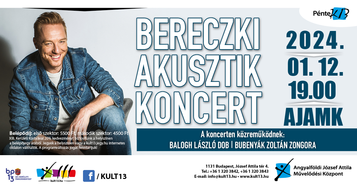 Belépődíj: Első szektor: 5500 Ft, Második szektor: 4500 Ft, XIII. Kerületi Kártyával 20% kedvezményt biztosítunk a helyszínen a belépőjegy árából. Jegyek a helyszínen vagy a kult13.jegy.hu internetes oldalon válthatók.