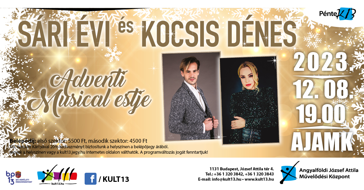 A Madách Szinház ünnepelt művésze, Sári Évi musical színésznő és énekesnő olyan előadásokban főszereplő, mint: a Mamma Mia, a Vámpírok bálja, a We Will Rock You, a Sakk Musical, az Apáca show és a most bemutatásra kerülő Pretty Woman musical. Valamint minden évben találkozhat a közönség mosolyával és hangjával a Szegedi Szabadtéri játékokon is. Partnere, Kocsis Dénes a Budapesti Operettszínház és Madách Színház kiemelkedő művésze, a Mozart, az Elfújta a szél, az Elizabeth, a Miss Saigon, az István a király, és a Puskás musicalek kiemelkedő szereplője. A fentiek alapján a koncertre érkezők egy igazán színvonalas és kivételes zenei élményekkel teli estét tölthetnek el a musicalcsillagok társaságában!